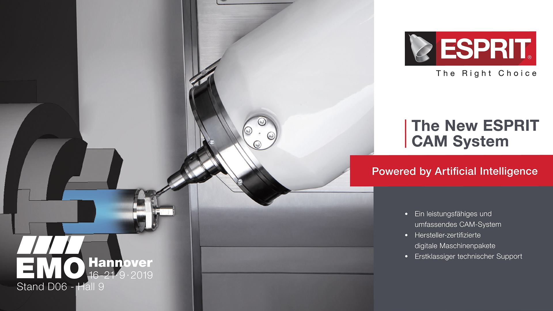 Journalisten und Besucher auf der EMO Hannover 2019, die mehr über das neue, auf künstlicher Intelligenz basierende CAM-System erfahren möchten, finden den ESPRIT-Stand in Halle 9, D06.