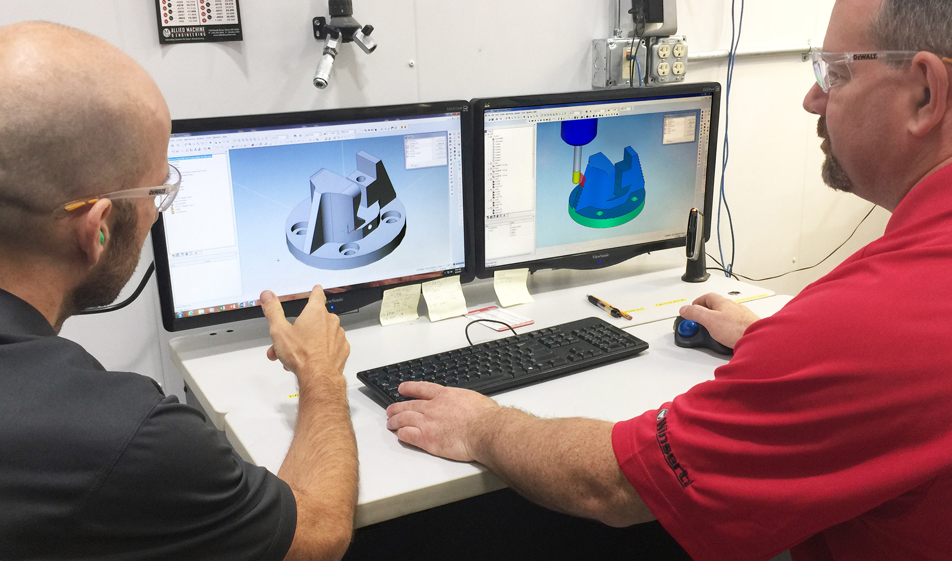 Paul Dickinson, zuständig für die Sonderanfertigungen bei Winsert (links), und Jeff Kubash, Techniker bei Winsert (rechts), erstellen mit ESPRIT eine kundenspezifische Spannvorrichtung zur Unterstützung der 5-Achs-Bearbeitung.
