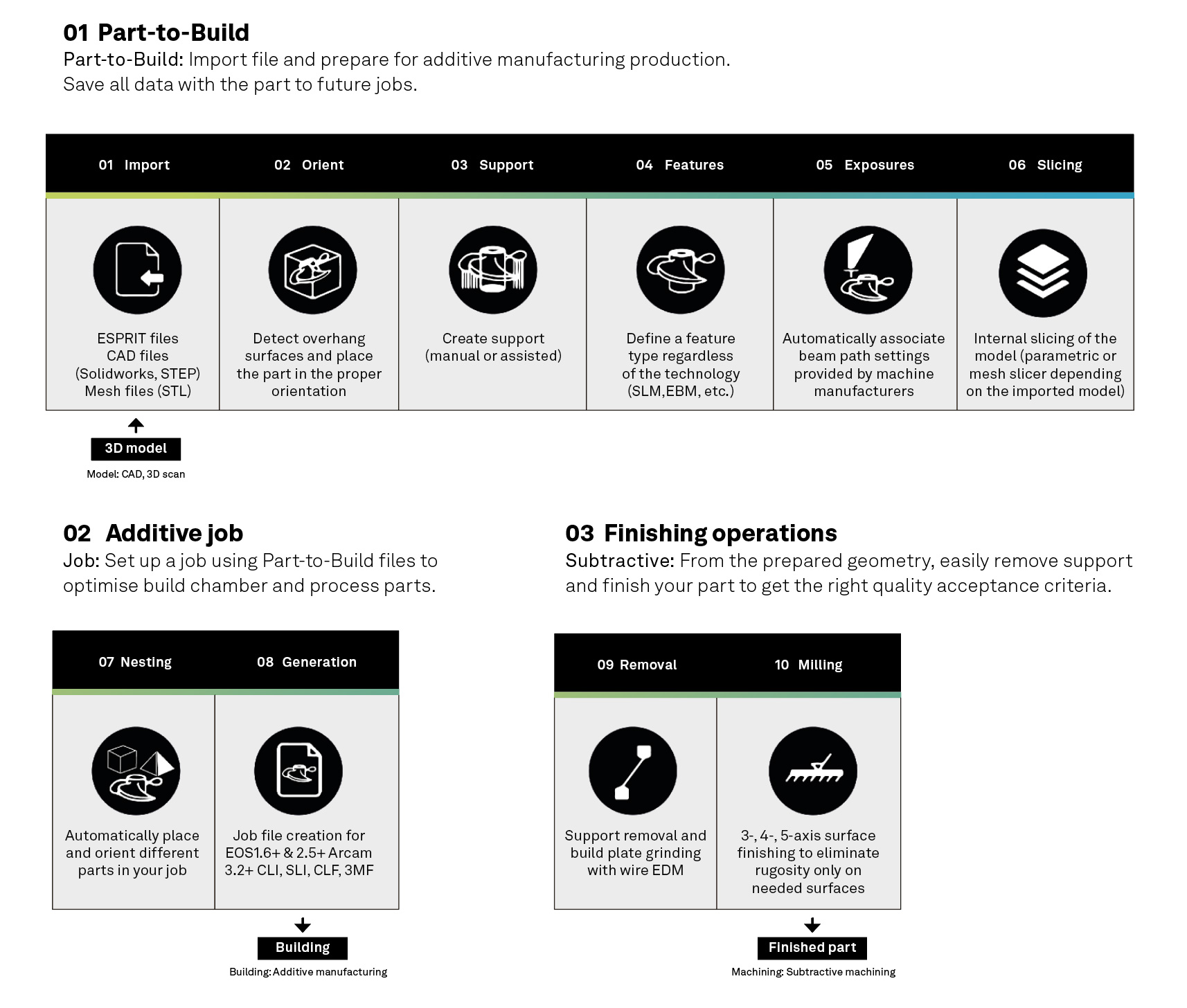 ESPRIT Additive PBF offers a unique, patented workflow dedicated to part production. This workflow has three stages: