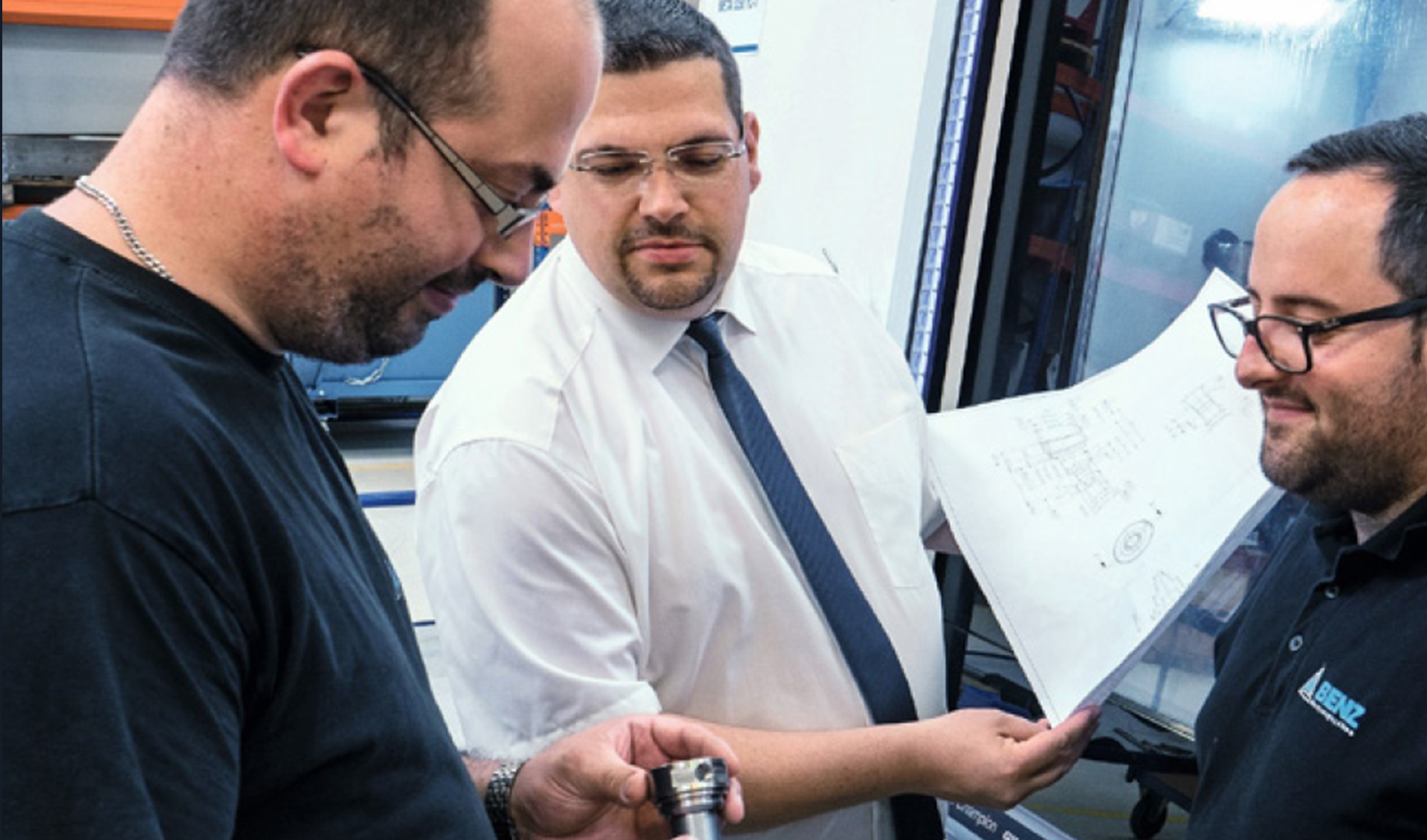 Jochen Tränkle (à gauche), chef d’équipe de la programmation FAO; Marco Huber (au centre), directeur général de BENZ; Manuel Göppert (à droite), opérateur de machine sur l’une des quatre machines TC Turn & Mill CTX beta de DMG MORI.