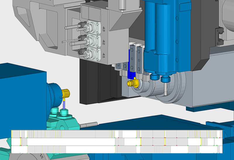 Con ESPRIT, puoi utilizzare la simulazione e la verifica della macchina integrata per provare in anticipo i programmi e risparmiare tempo prezioso per la macchina. Basato su un gemello digitale (digital twin) della macchina a fantina mobile, la simulazione mostra in tempo reale tutte le operazioni di lavorazione. Ciò fornisce una visione animata estremamente accurata dell'intero processo, compresi i cicli, i movimenti e i componenti specifici della fantina mobile. Potrai così convalidare il programma con il rilevamento delle collisioni tra l'utensile, la parte e tutti i componenti della macchina.