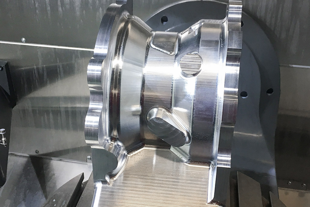The sheer breadth of components manufactured by Quick Drive is one element of their success. “We build drive units, torque converters, and specialty pneumatic products for drag racing, monster trucks, tractor pullers, drag boats, land speed vehicles, and various high-end custom vehicles,” says Brock. “Our drive unit is composed of more than 20 individual components. The most complex part is a full-billet aluminum case that starts life as a 113-pound cube. It gets machined down to around 11 pounds over the course of about 27 hours of 5-axis machine time. Our converters are made from 6061 aluminum and use a combination of ProfitMilling, trochoidal channel roughing, and the 5-axis impeller strategy to complete,” Brock says.